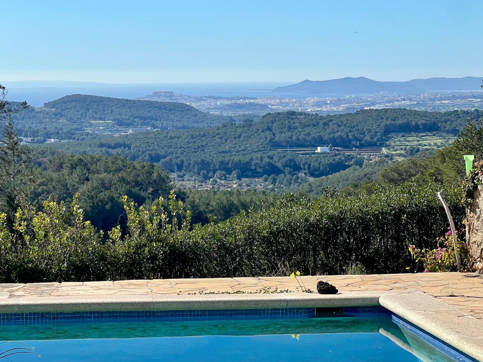 Nestled on a peaceful hillside near the charming village of Santa Gertrudis, this traditional Ibicencan finca boasts truly spectacular panoramic views—spanning the rolling hills of the island, the iconic skyline of Ibiza’s old town, and extending all the way to the shimmering waters of Formentera.