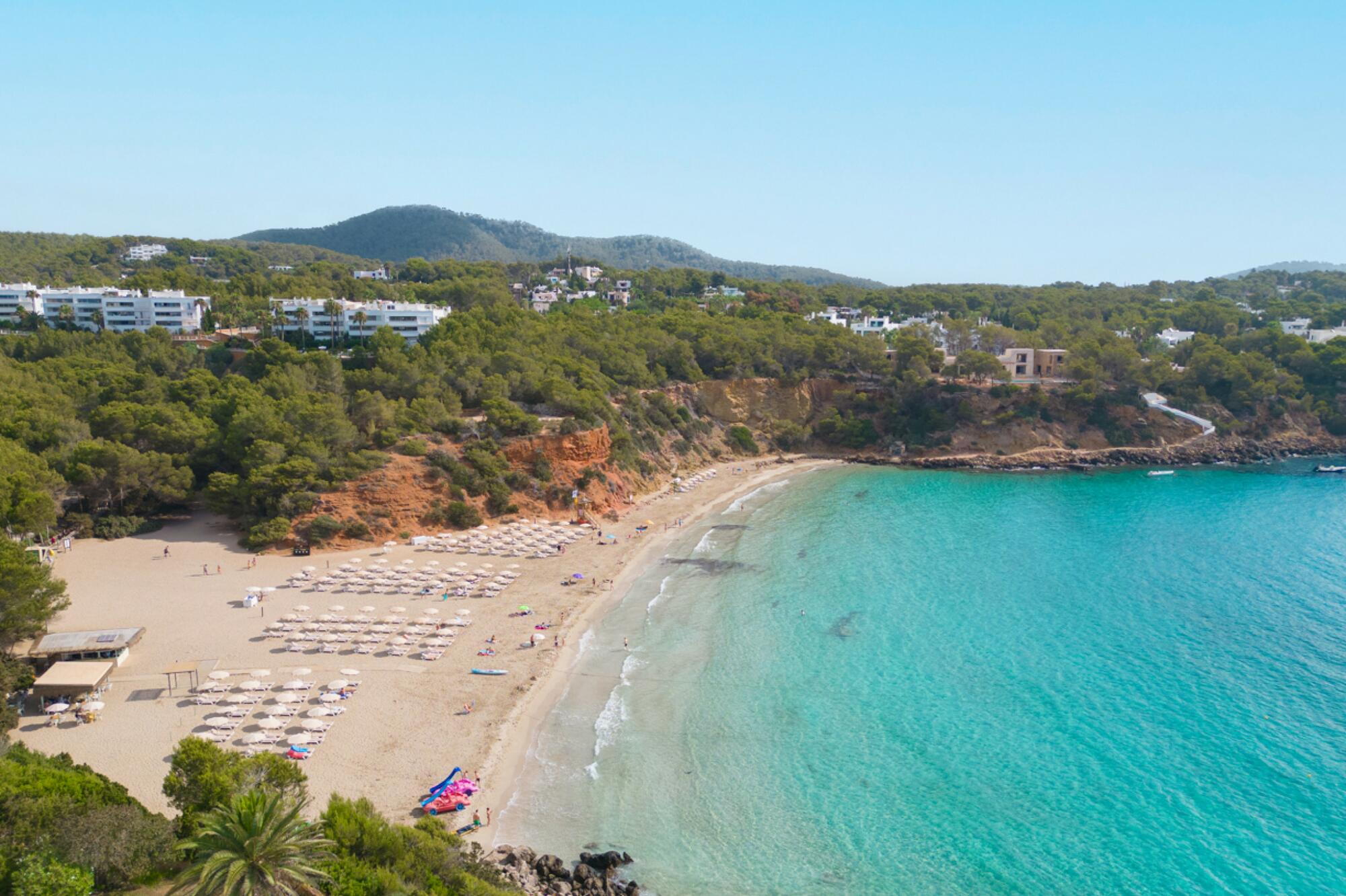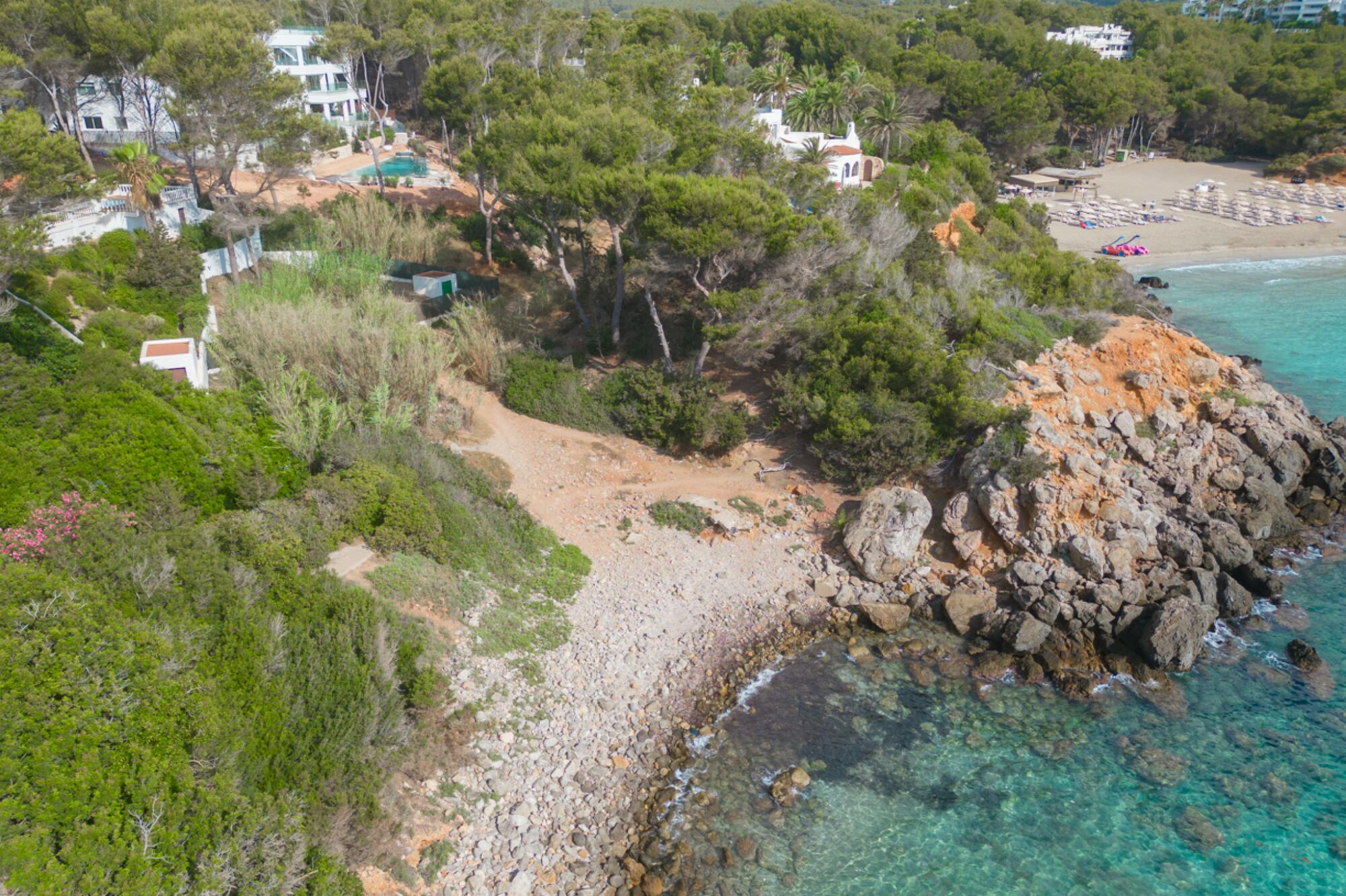The building's east-facing orientation presents captivating sunrise views and is conveniently located just a brief 10-minute drive from the charming village of San Carlos. For beach enthusiasts, the pristine shores of Cala Llenya are a mere 2-minute walk away, offering a picturesque escape. Moreover, a secluded cove nearby maintains its private allure even during the bustling summer months.