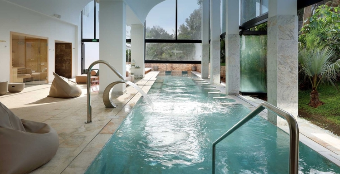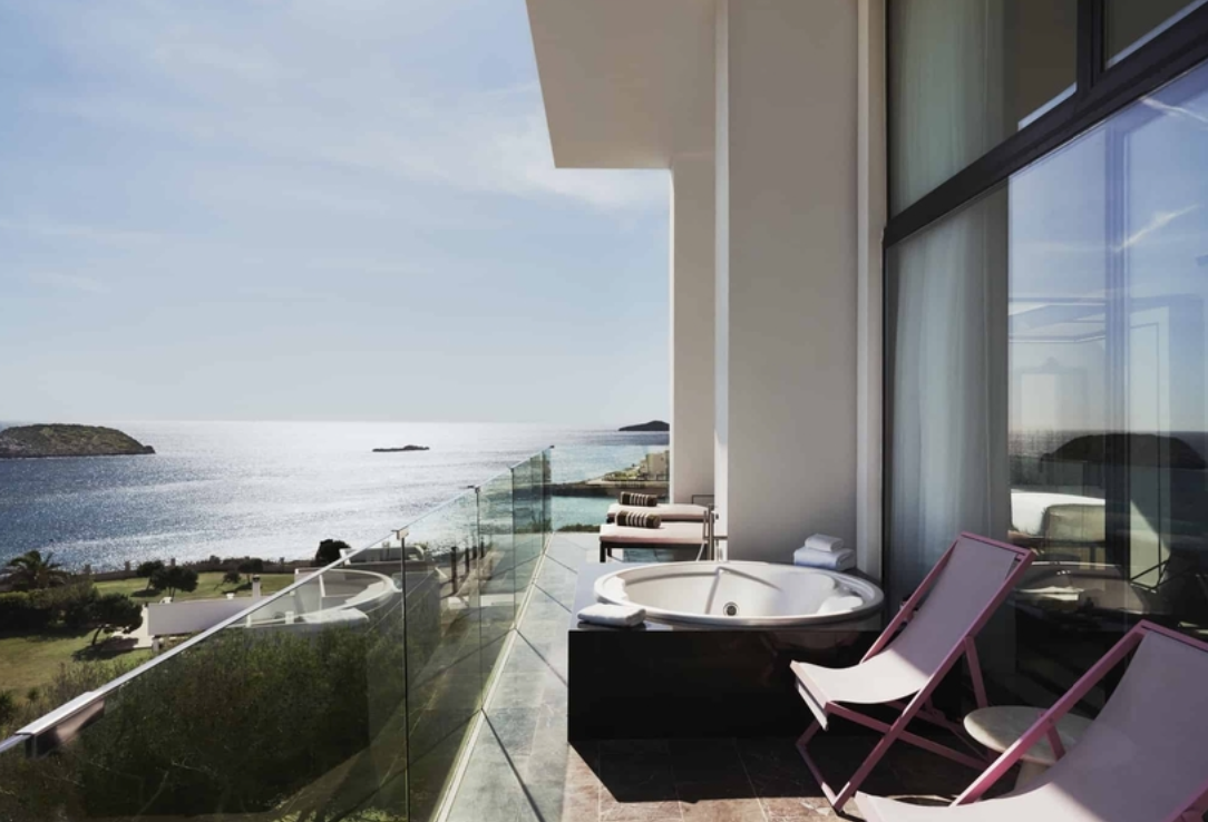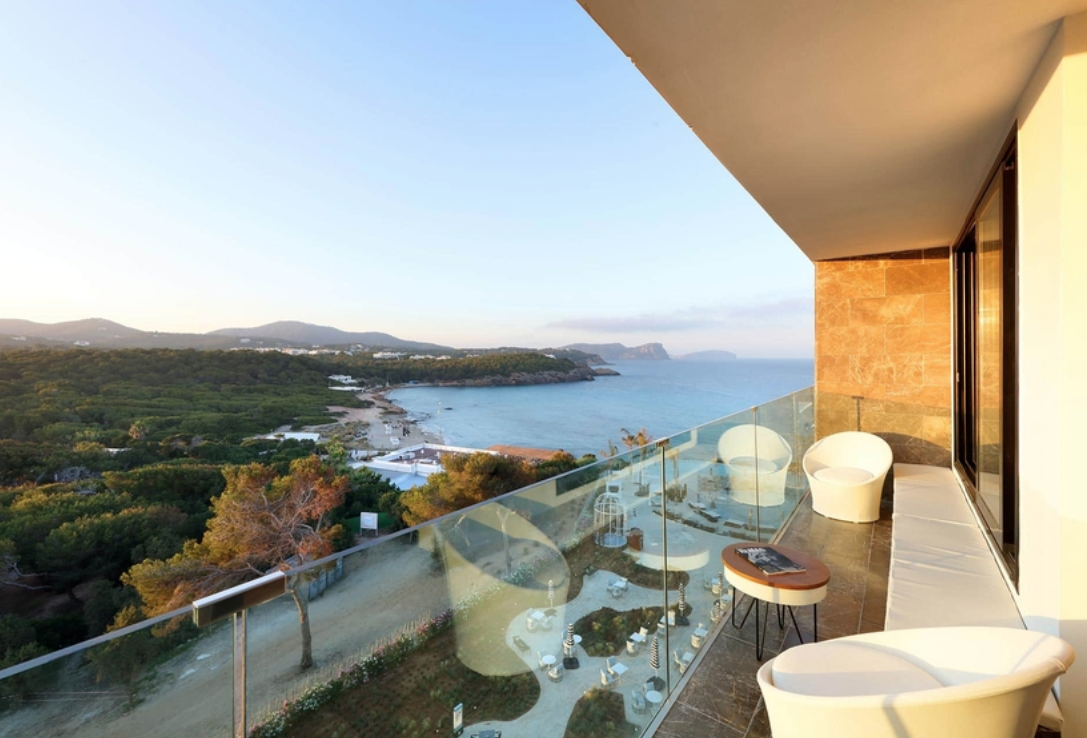 Luxury beachfront hotel in Ibiza featuring 151 soundproof rooms and suites with a modern minimalist design and full amenities. The property offers three swimming pools, a spa and wellness area (Turkish bath, sauna, jacuzzi), fitness center, and rooftop bar with sea views.