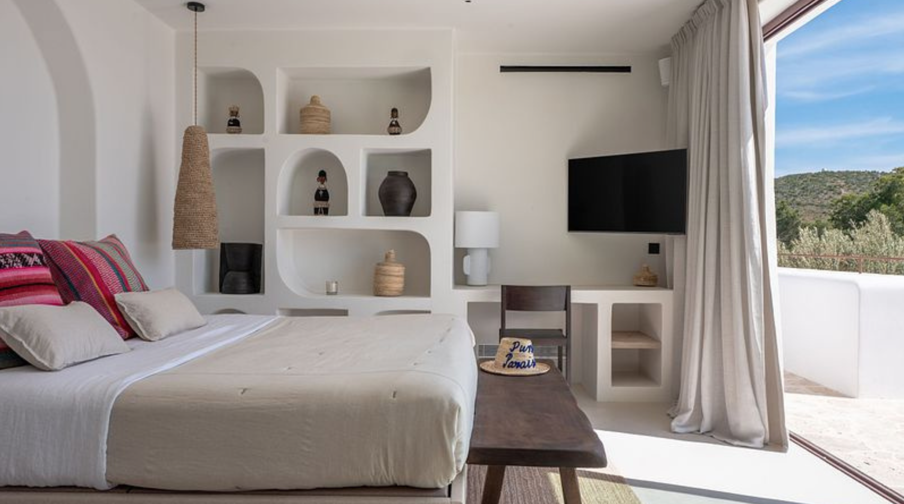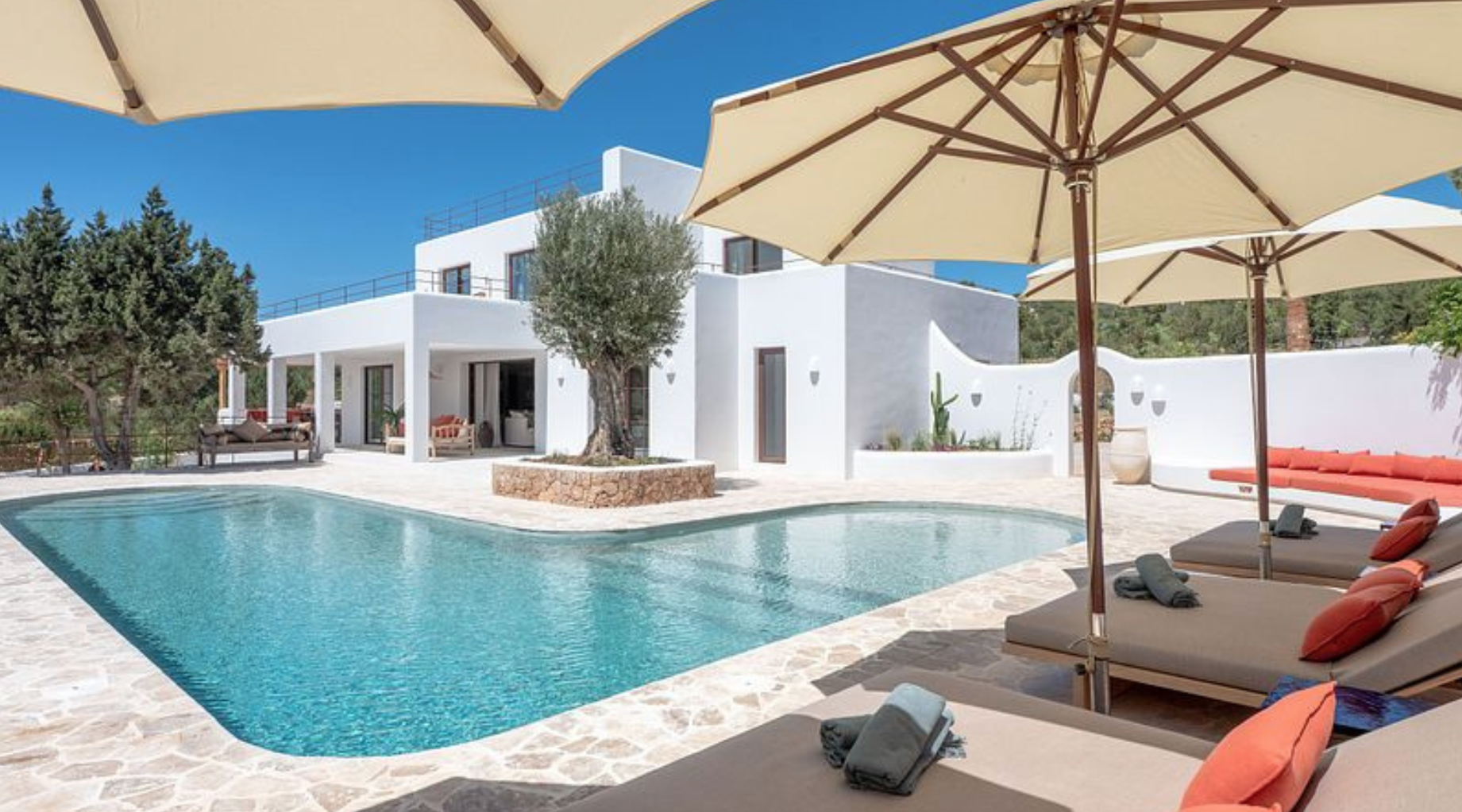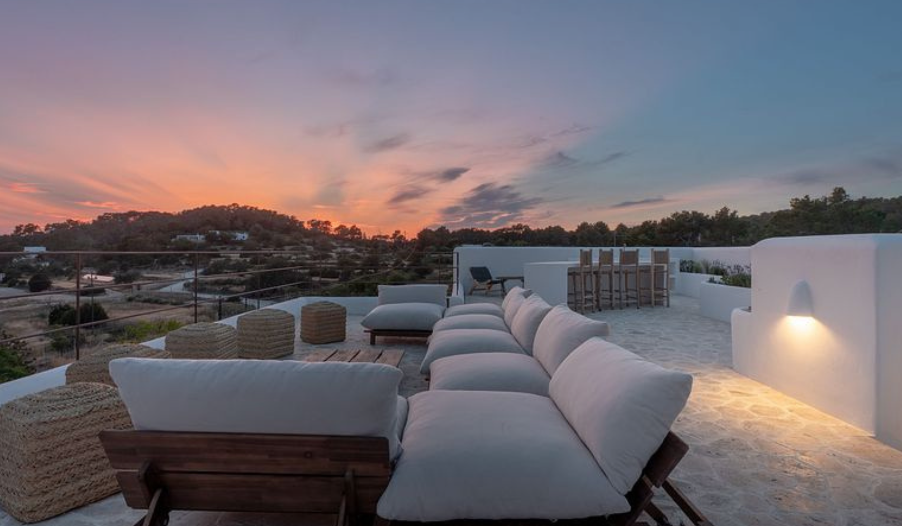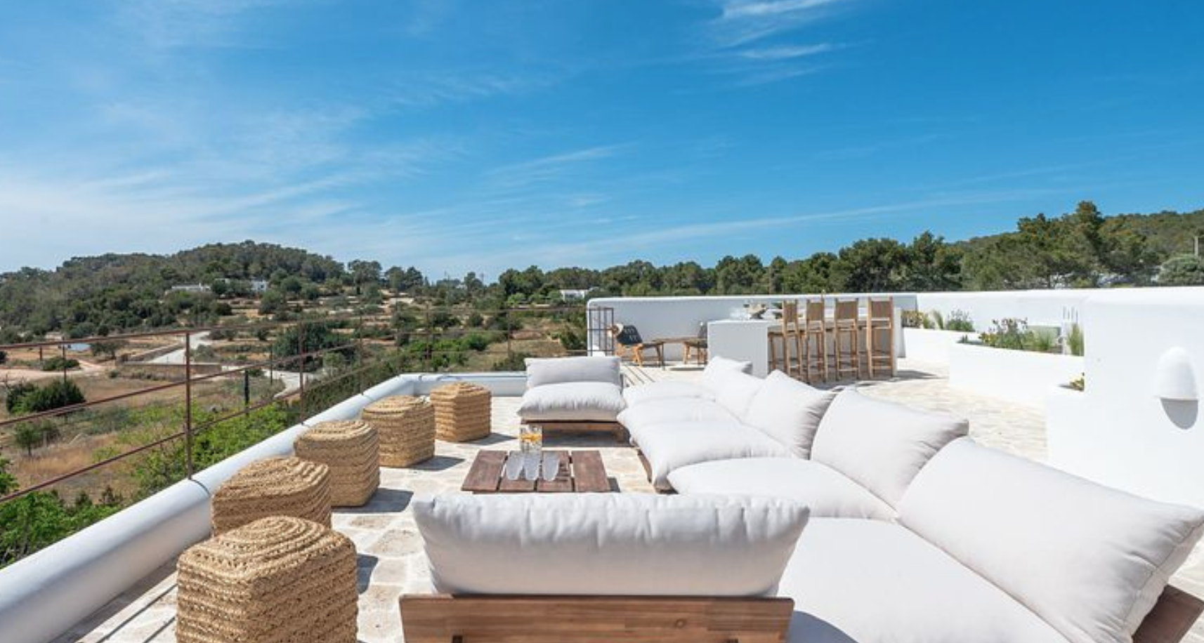 Set on a generous plot of over 2,000 m², the villa offers 355 m² of living space, thoughtfully distributed across six elegant suites, including a family room with one double and two single beds, comfortably accommodating up to 14 guests. Designed with both style and comfort in mind, the interiors showcase a chic Ibizan flair combined with contemporary finishes, while air conditioning throughout the house ensures maximum comfort year-round.