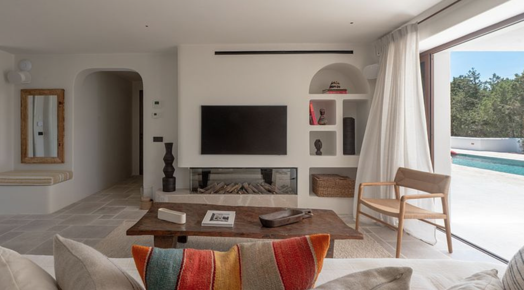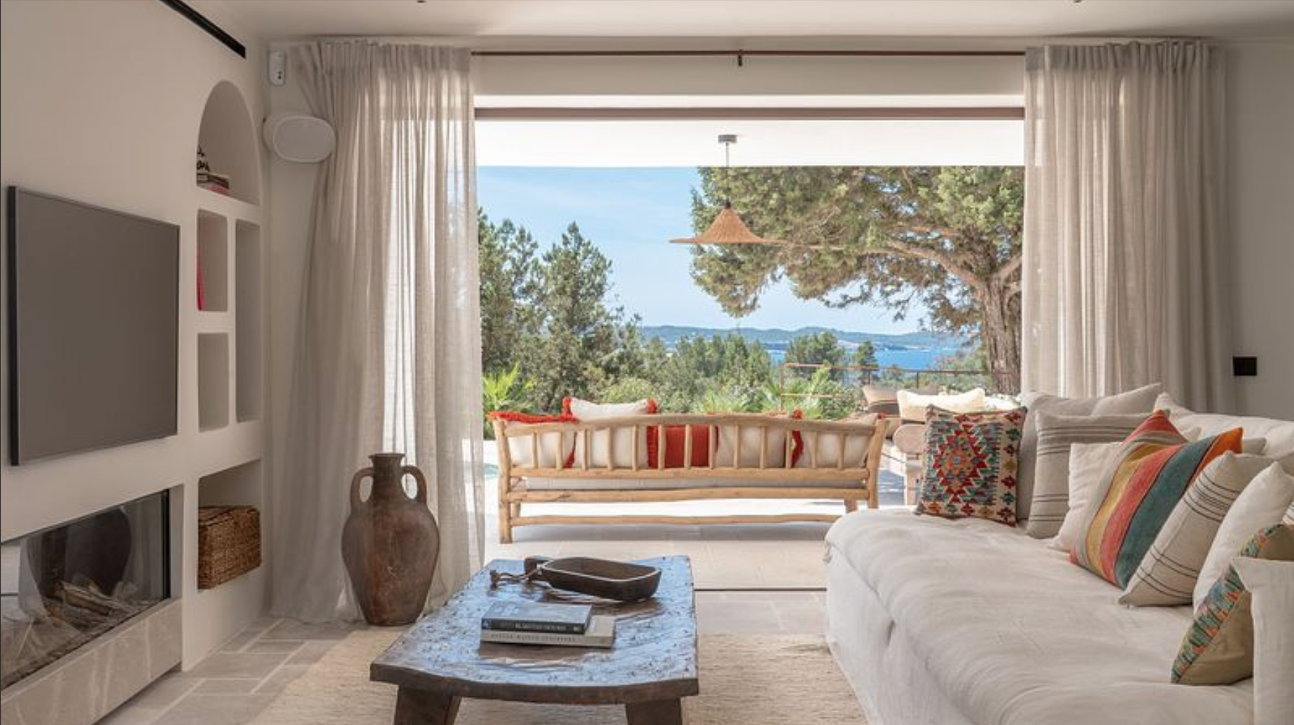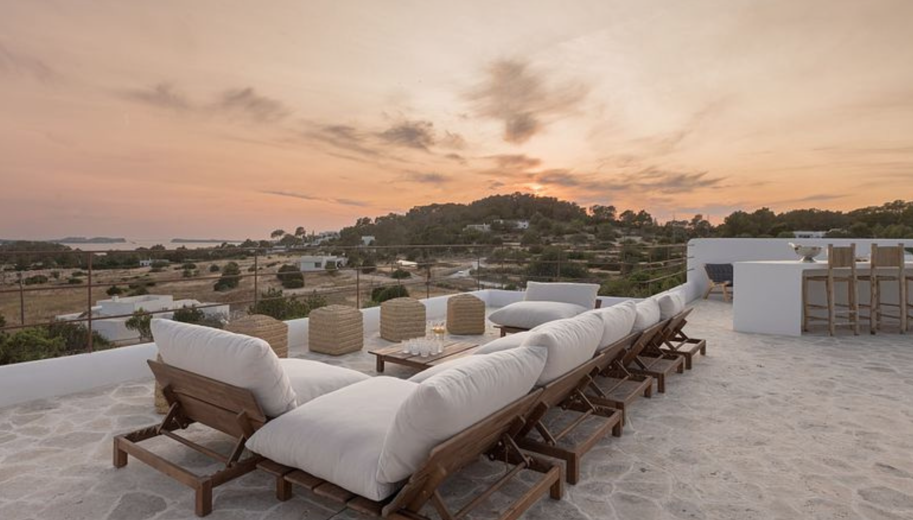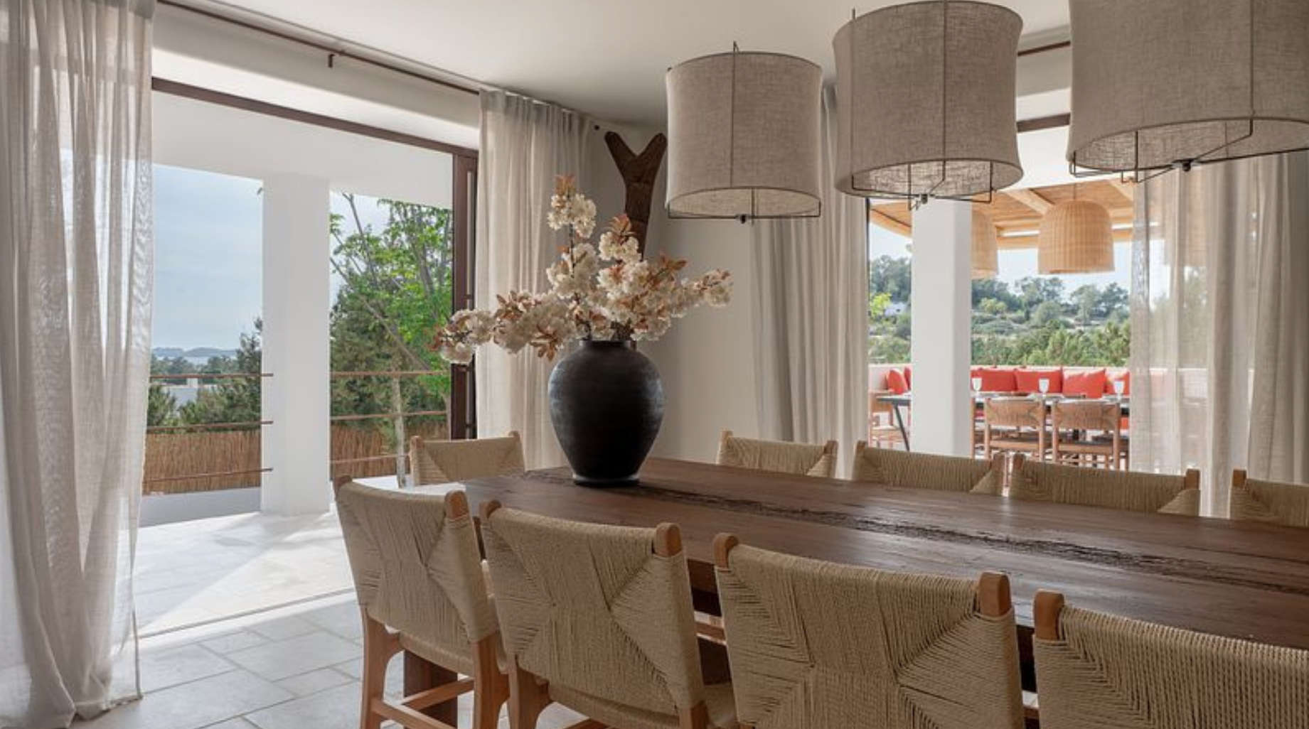 Set on a generous plot of over 2,000 m², the villa offers 355 m² of living space, thoughtfully distributed across six elegant suites, including a family room with one double and two single beds, comfortably accommodating up to 14 guests. Designed with both style and comfort in mind, the interiors showcase a chic Ibizan flair combined with contemporary finishes, while air conditioning throughout the house ensures maximum comfort year-round.