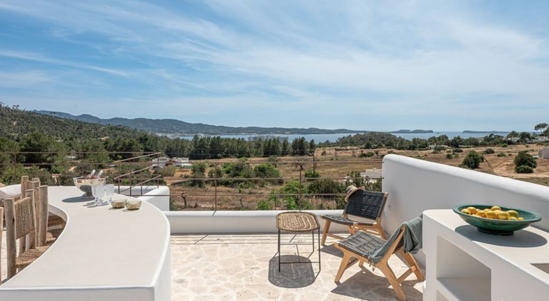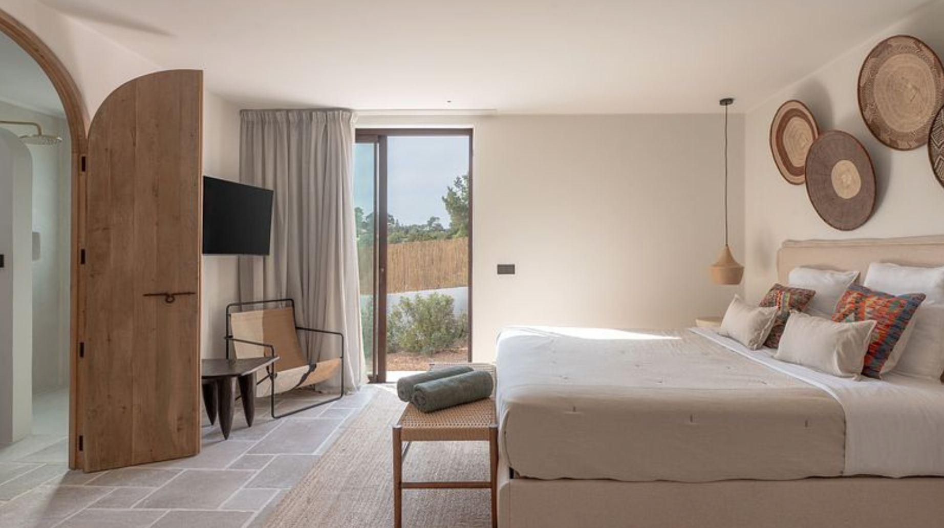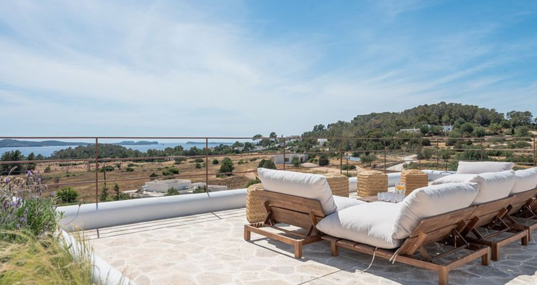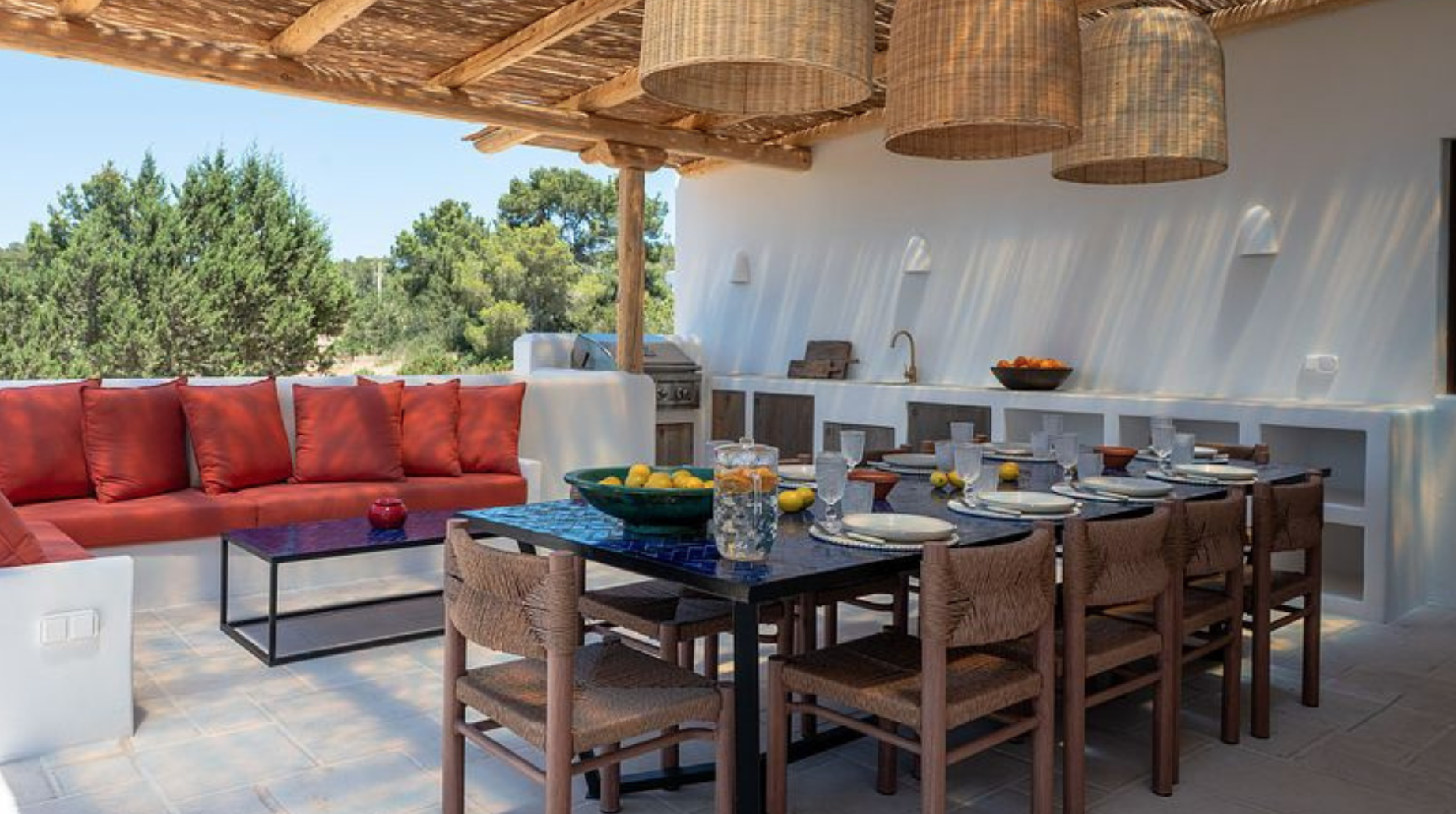 Set on a generous plot of over 2,000 m², the villa offers 355 m² of living space, thoughtfully distributed across six elegant suites, including a family room with one double and two single beds, comfortably accommodating up to 14 guests. Designed with both style and comfort in mind, the interiors showcase a chic Ibizan flair combined with contemporary finishes, while air conditioning throughout the house ensures maximum comfort year-round.
