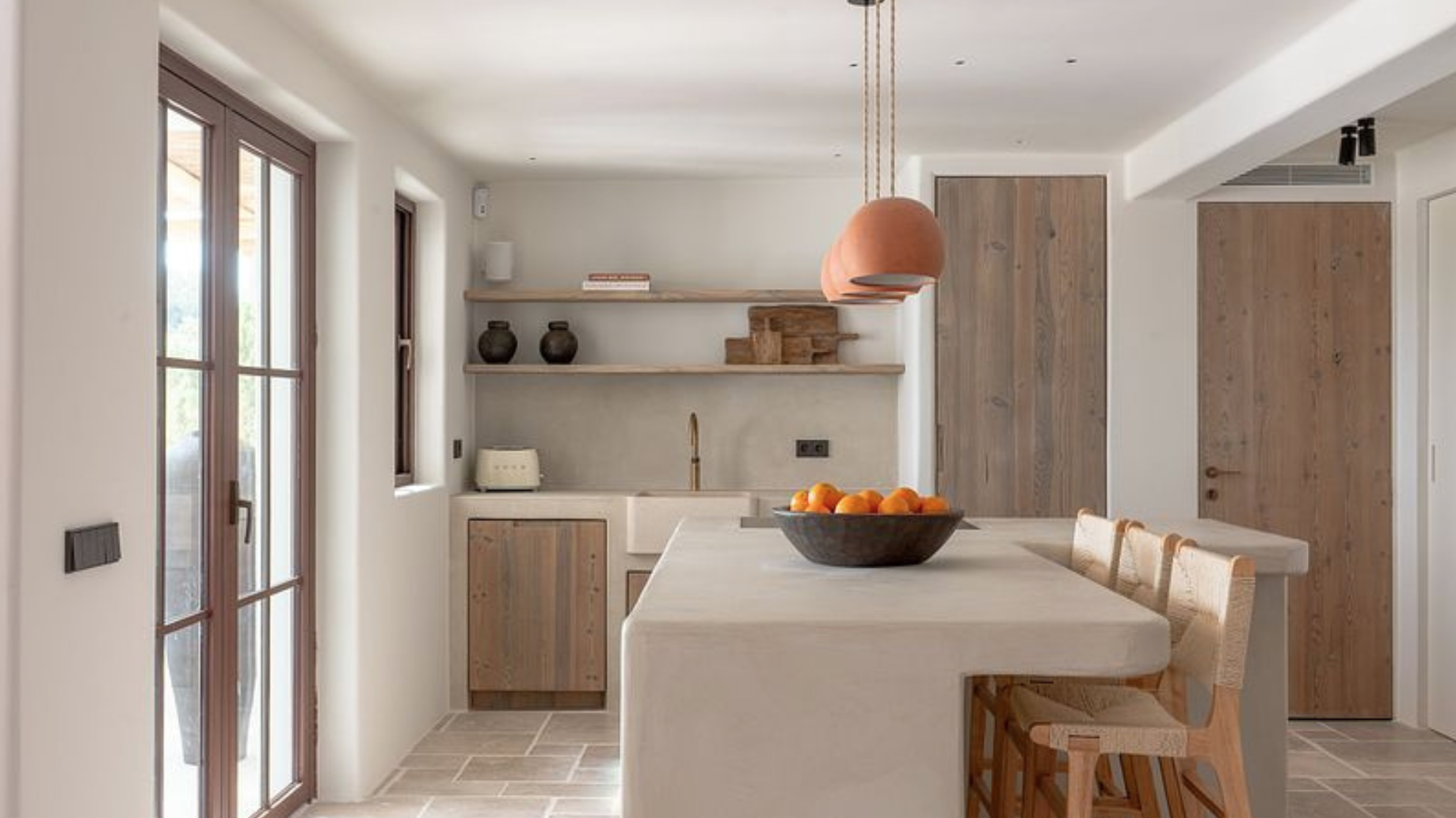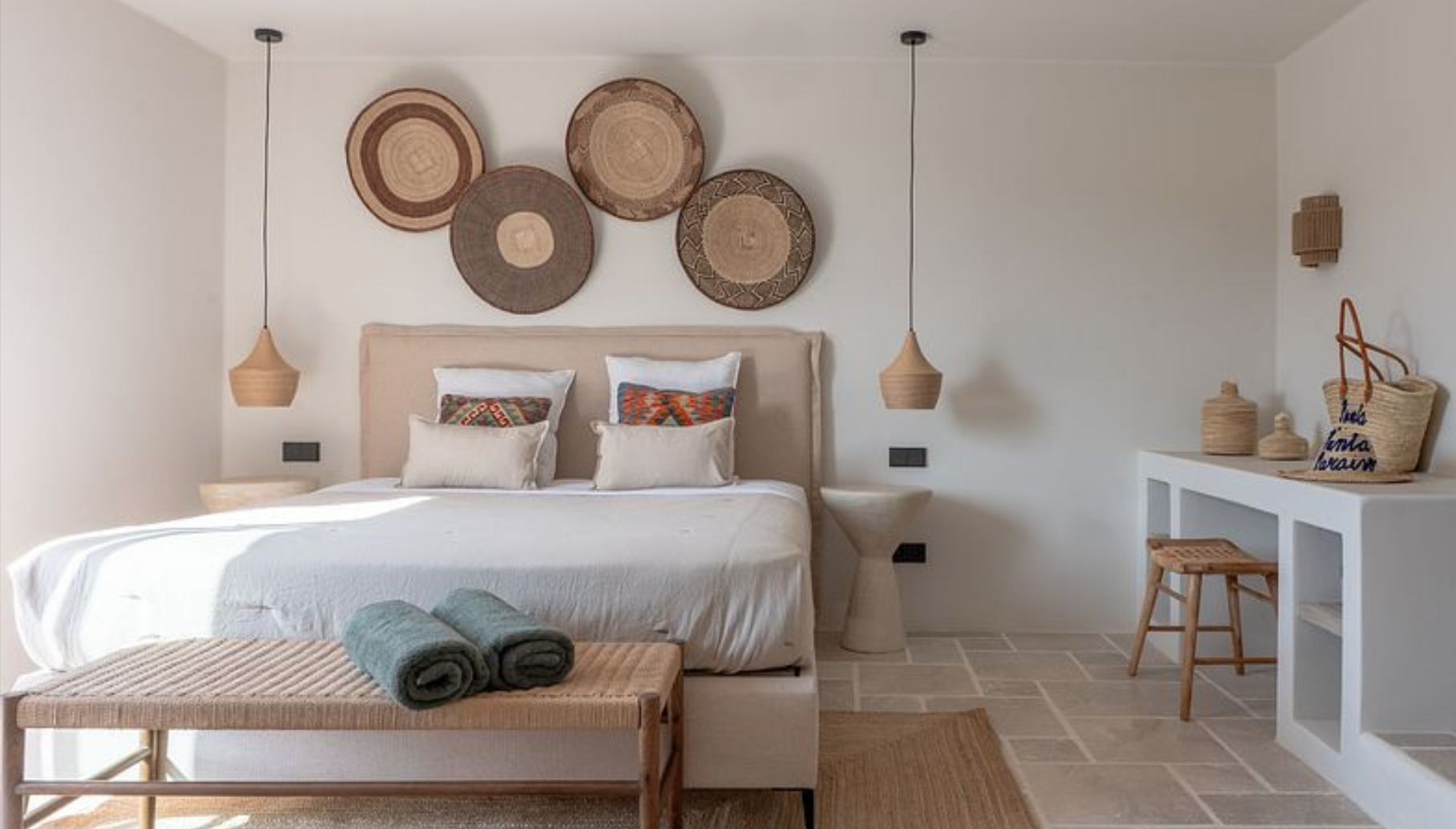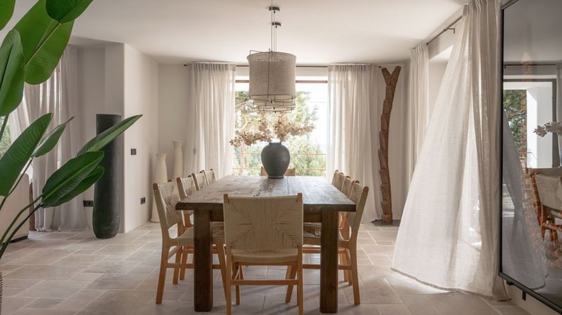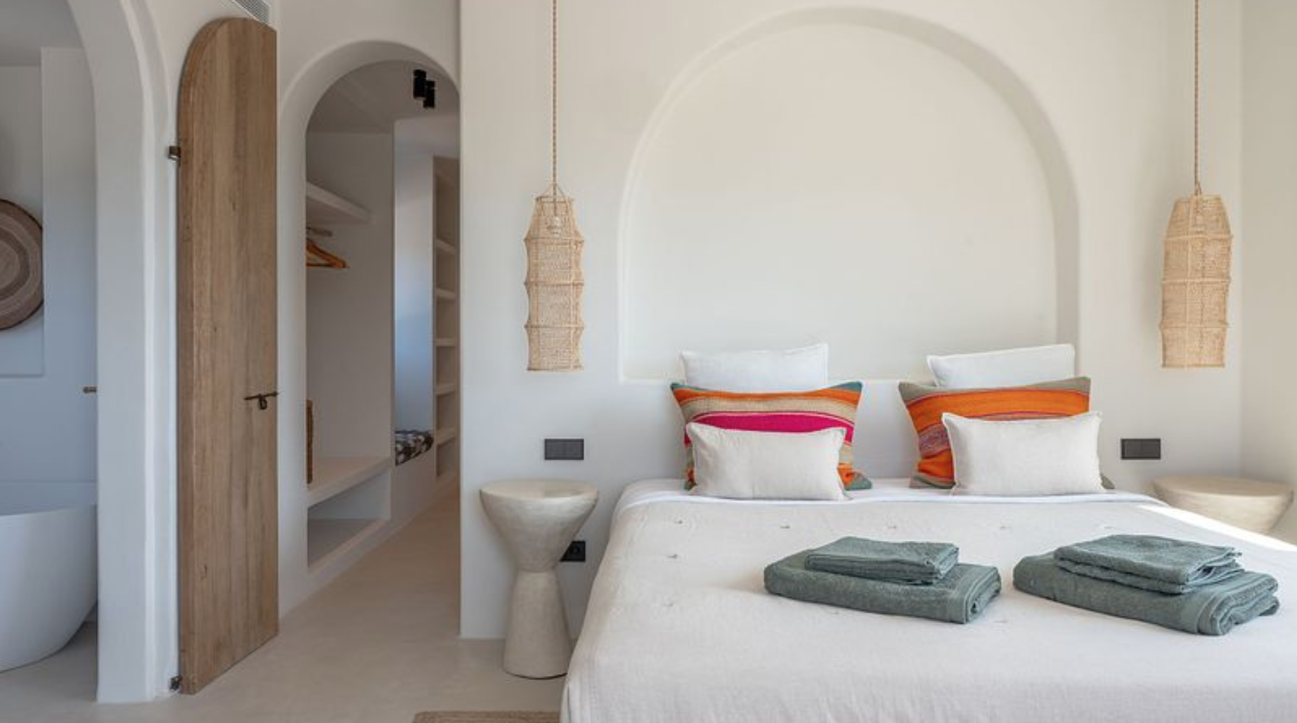 Set on a generous plot of over 2,000 m², the villa offers 355 m² of living space, thoughtfully distributed across six elegant suites, including a family room with one double and two single beds, comfortably accommodating up to 14 guests. Designed with both style and comfort in mind, the interiors showcase a chic Ibizan flair combined with contemporary finishes, while air conditioning throughout the house ensures maximum comfort year-round.