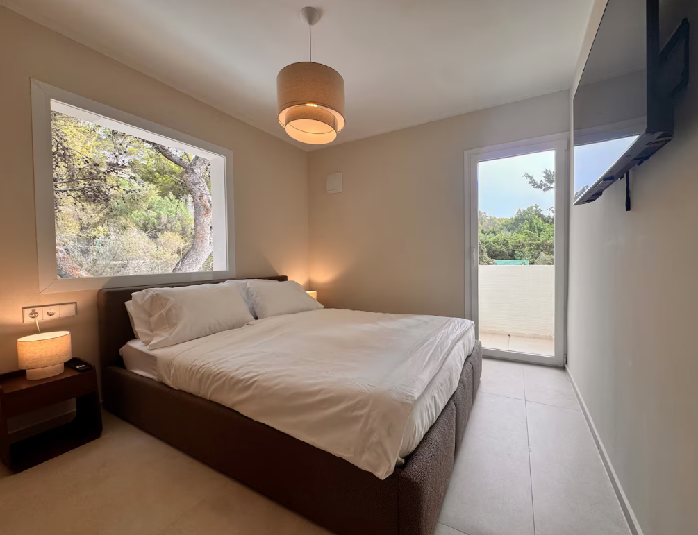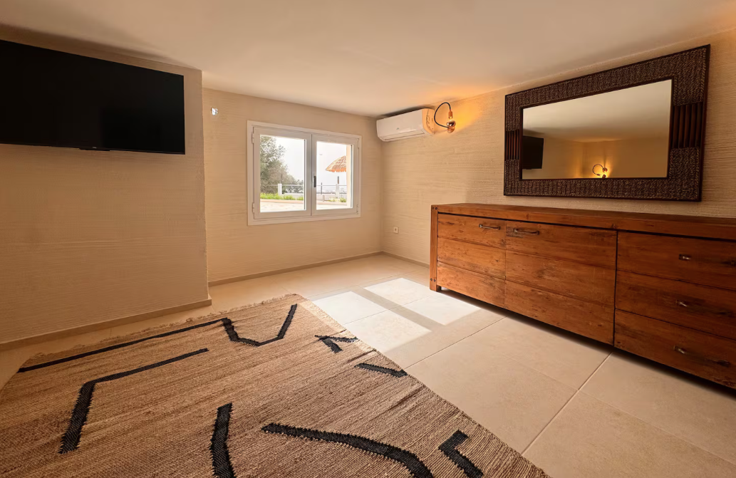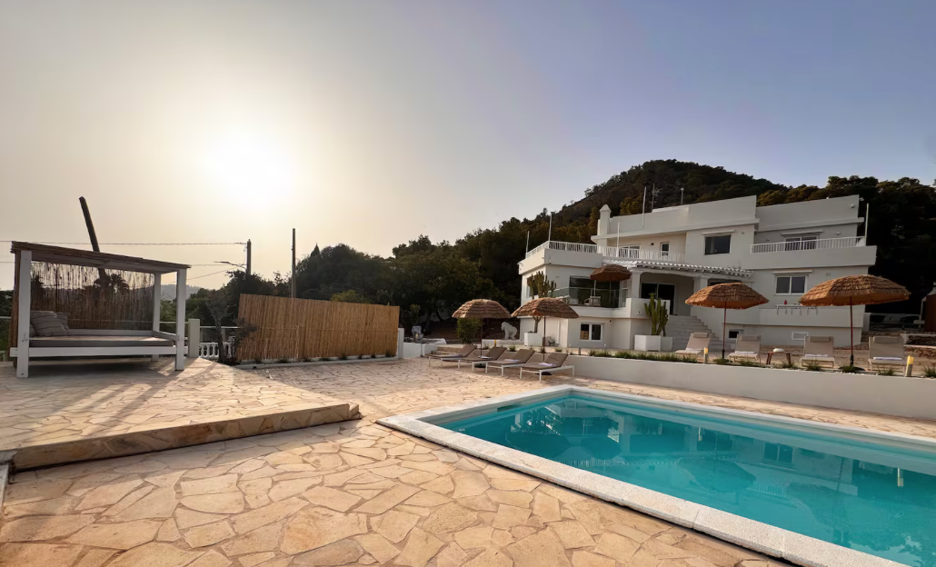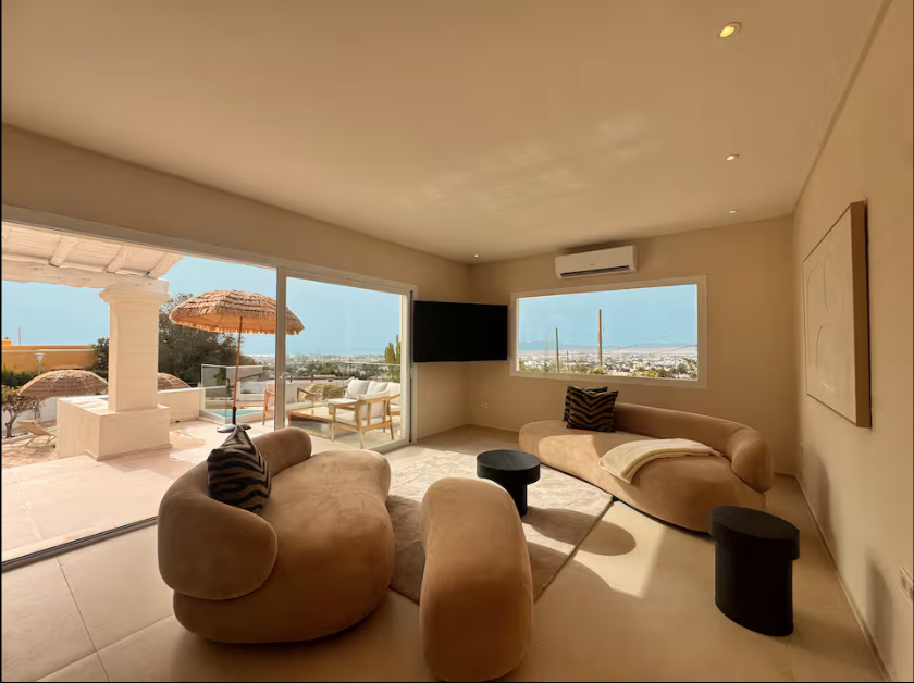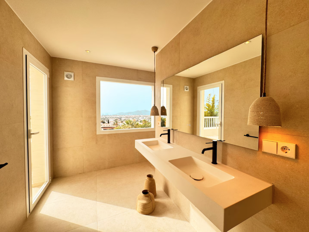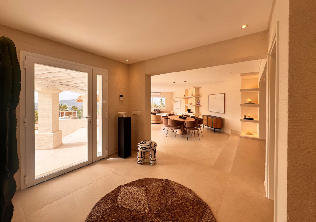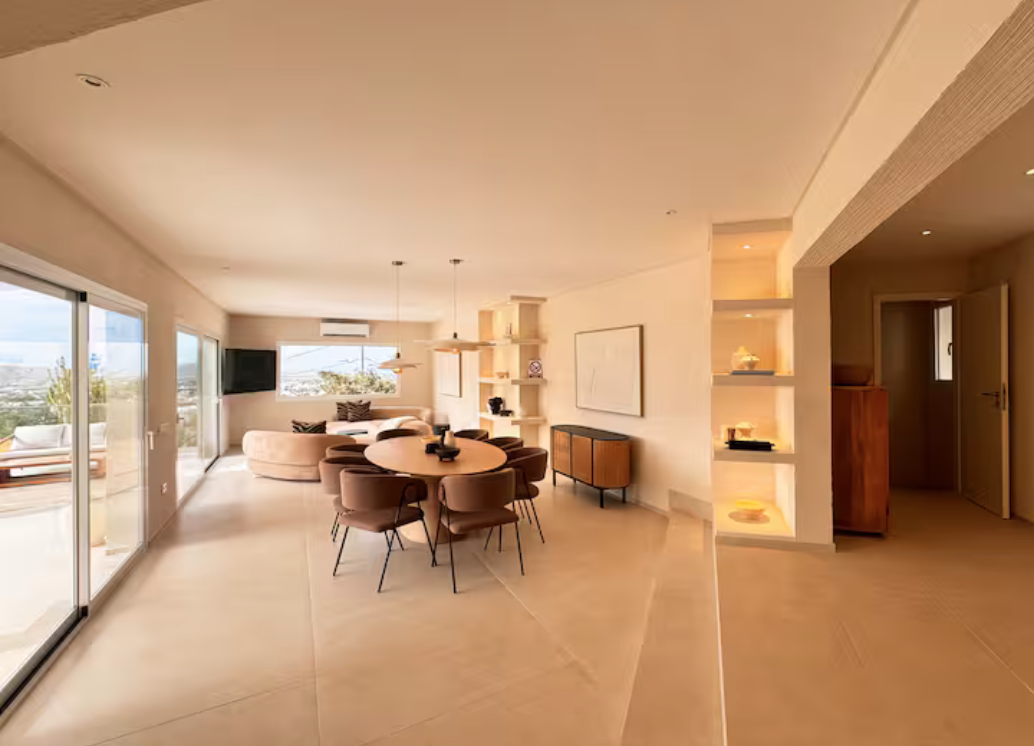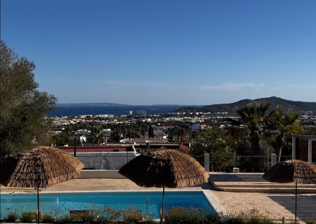 The villa is situated on a mountain, so every morning when you wake up you can enjoy the sunrise and a breathtaking view of the sea. The location is extremely convenient, as it means a drive of less than eight minutes to both the airport and Ibiza Town. The nearest beach is only five minutes away by car.
