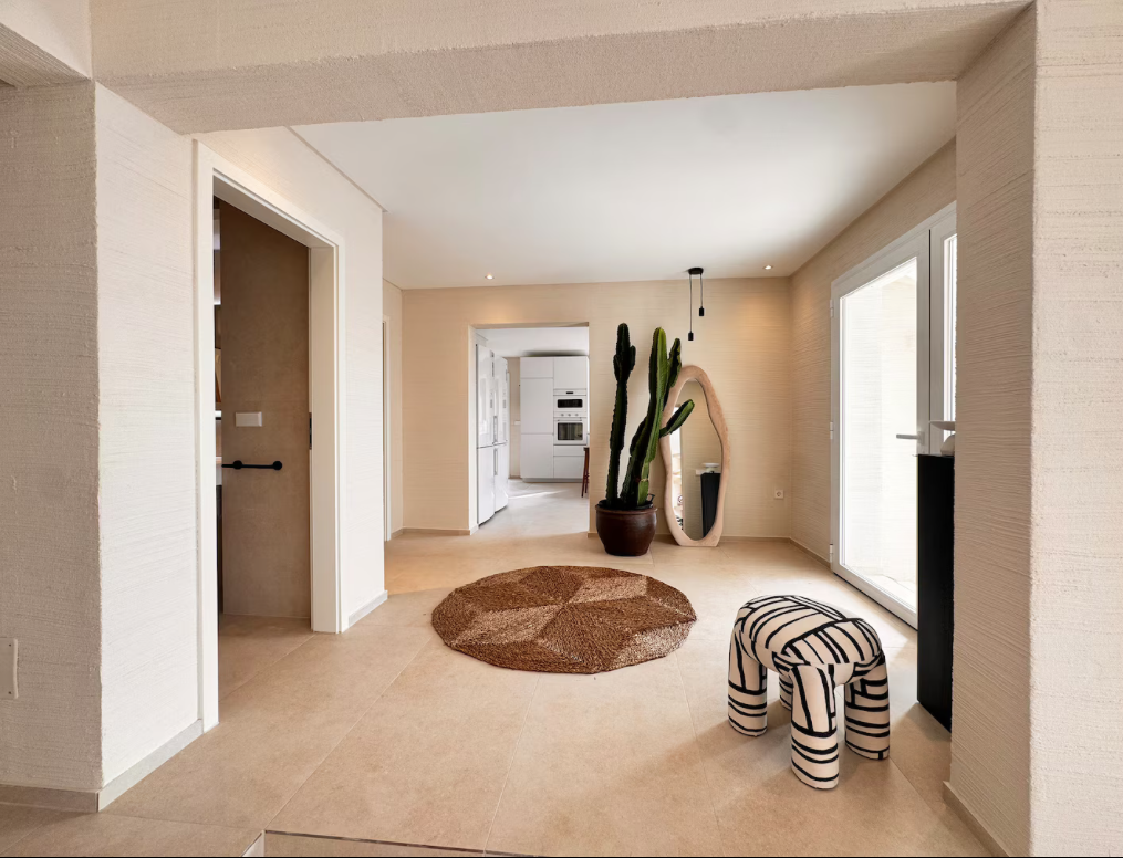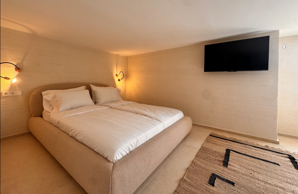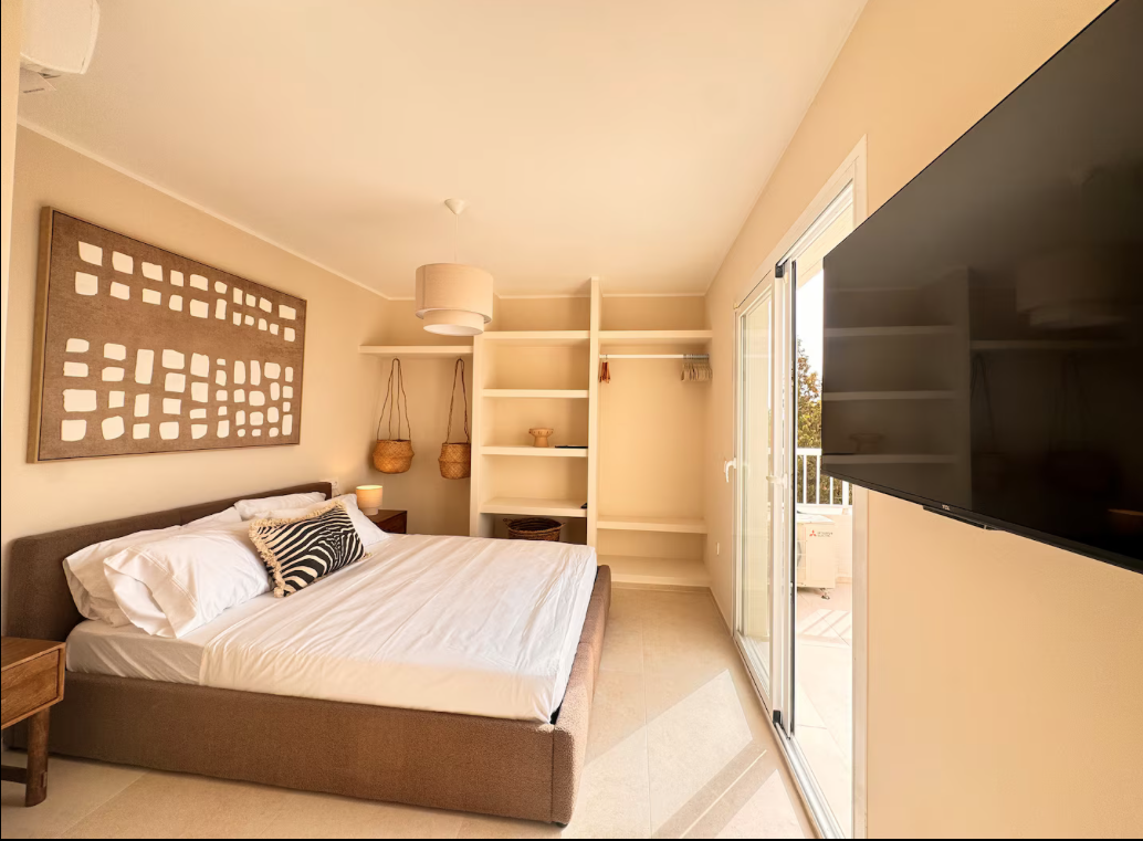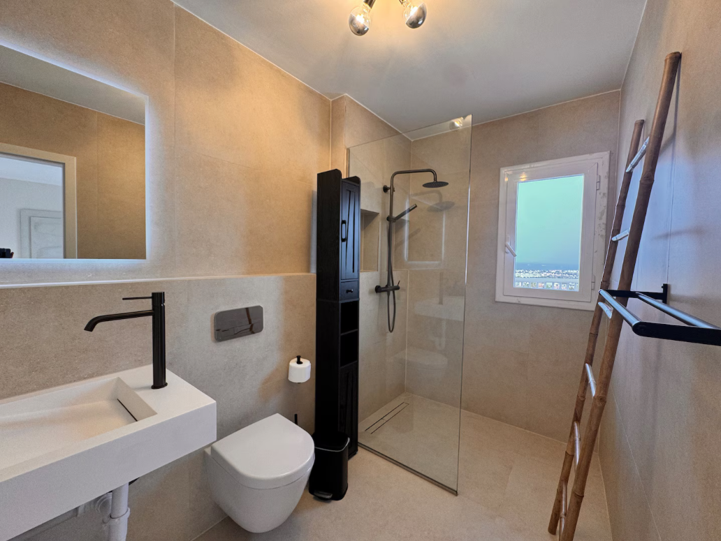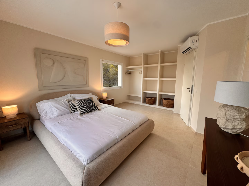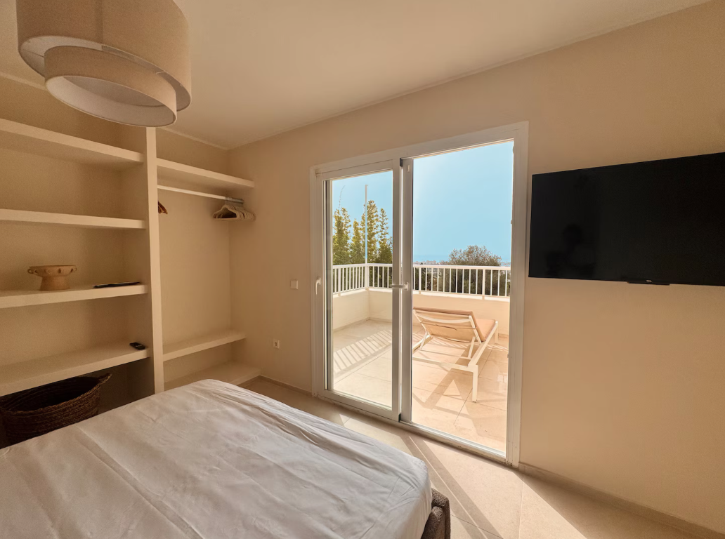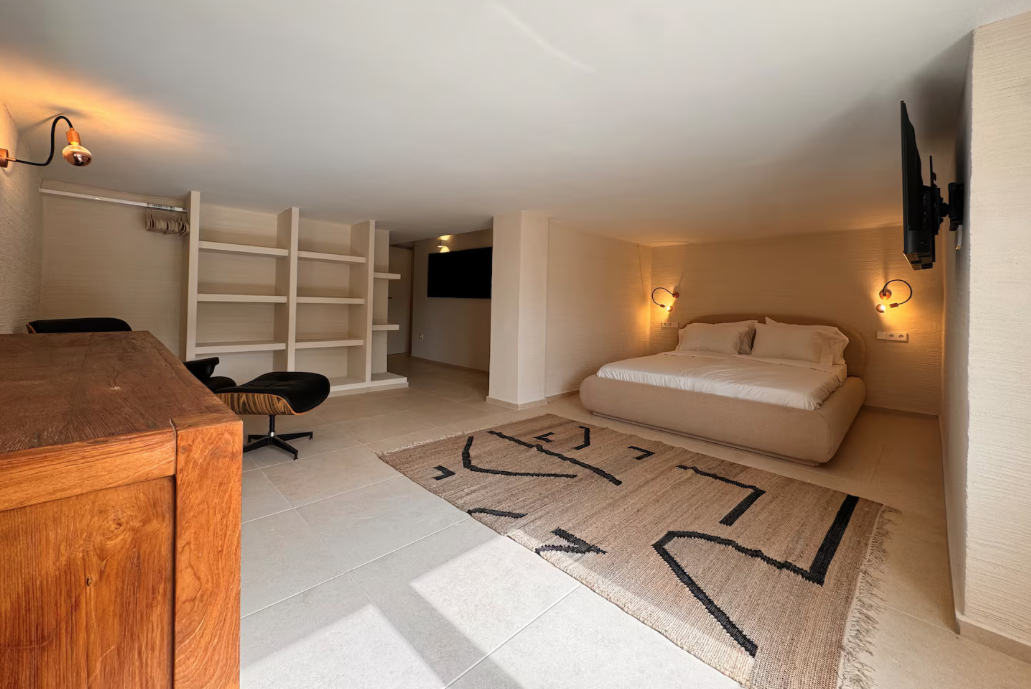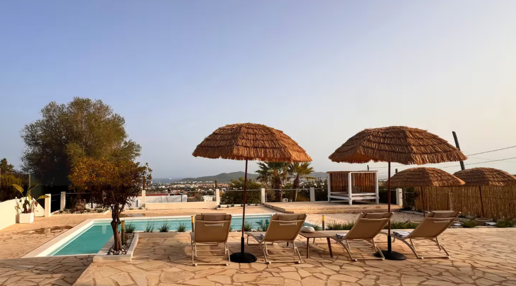 The villa is situated on a mountain, so every morning when you wake up you can enjoy the sunrise and a breathtaking view of the sea. The location is extremely convenient, as it means a drive of less than eight minutes to both the airport and Ibiza Town. The nearest beach is only five minutes away by car.